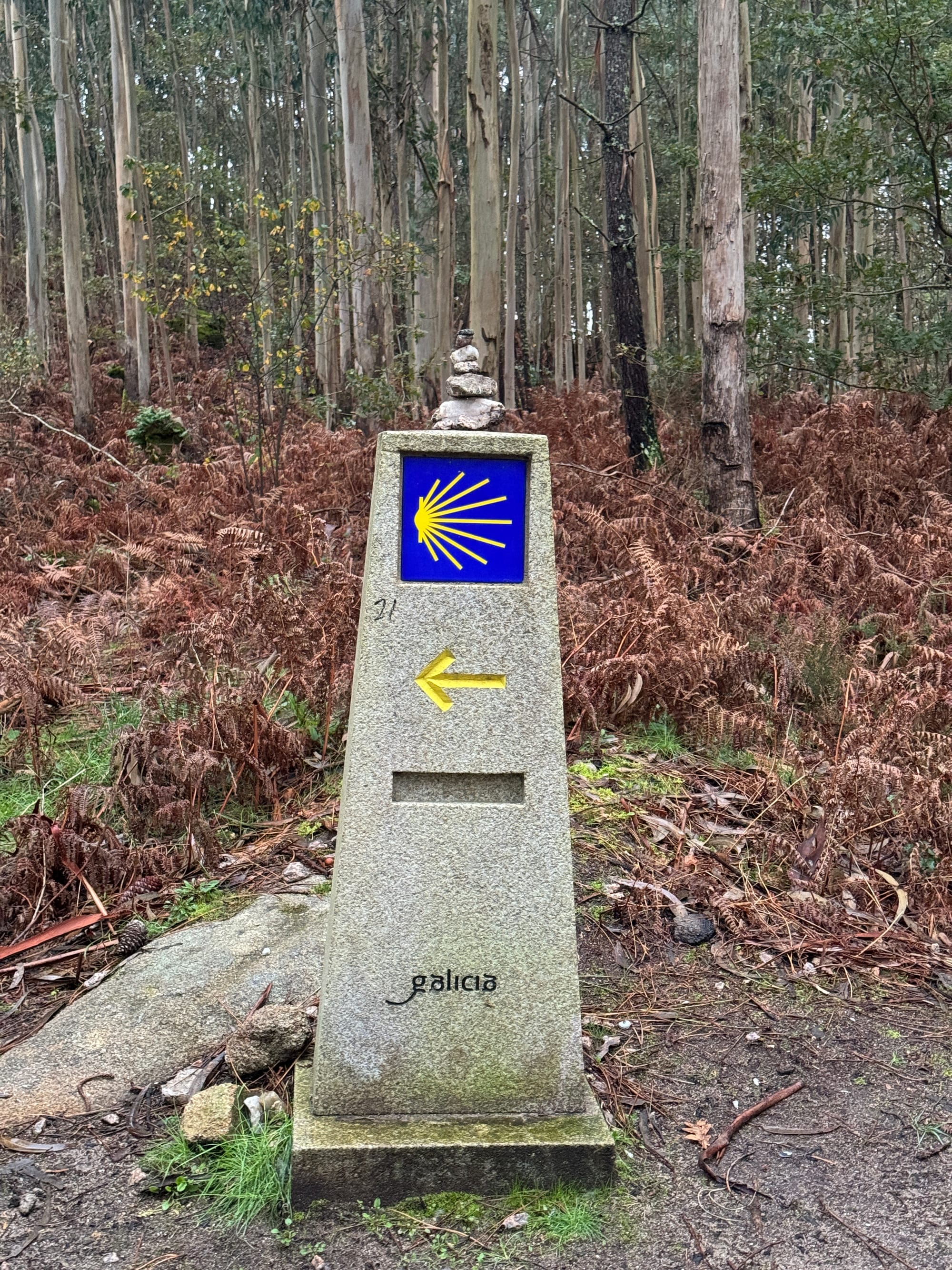 Yet, right in front of me I see a stone pilon with the quintessential yellow seashell, arrow on a blue background pointing me on up the hill. He seems to be thoroughly unconvinced by the reality in front of him and possessed by his map.