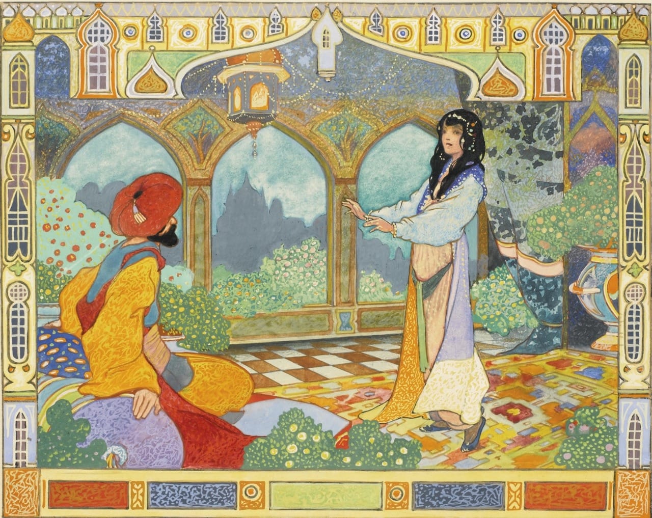 However, in the midst of his hunt to recover his arrow, Prince Ahmad wanders into the layer of the genie Pari-Banou, a ‘sumptuous grotto’ where he discovers it was she who provided all three magical objects to the brothers. She entices Ahmad to stay with her there, for she is far more beautiful than his cousin. He does so and lives with her for some time.